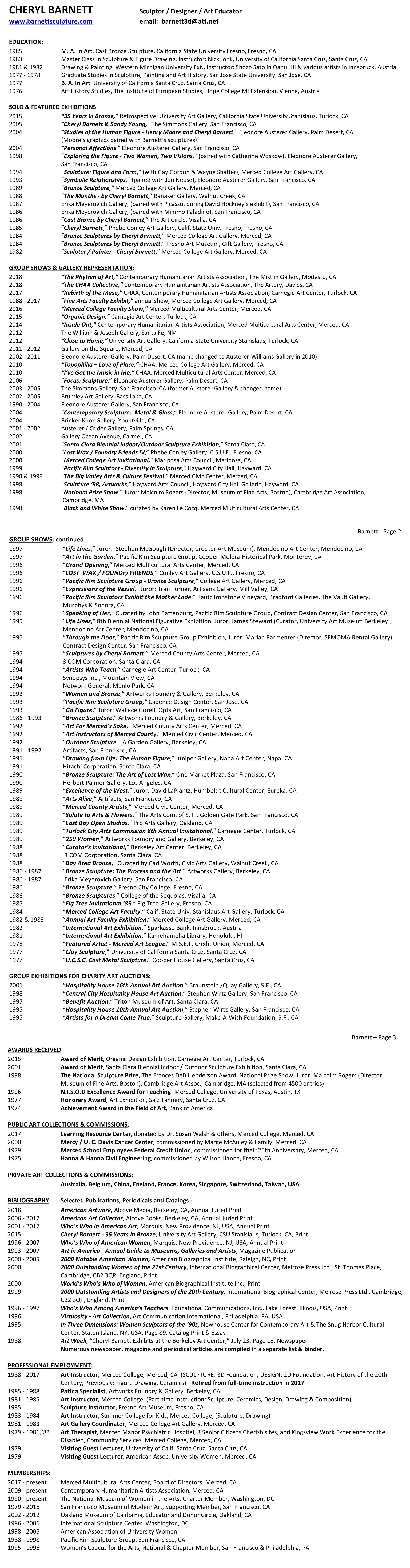 1984 “Bronze Sculptures by Cheryl Barnett,” Merced College Art Gallery, Merced, CA